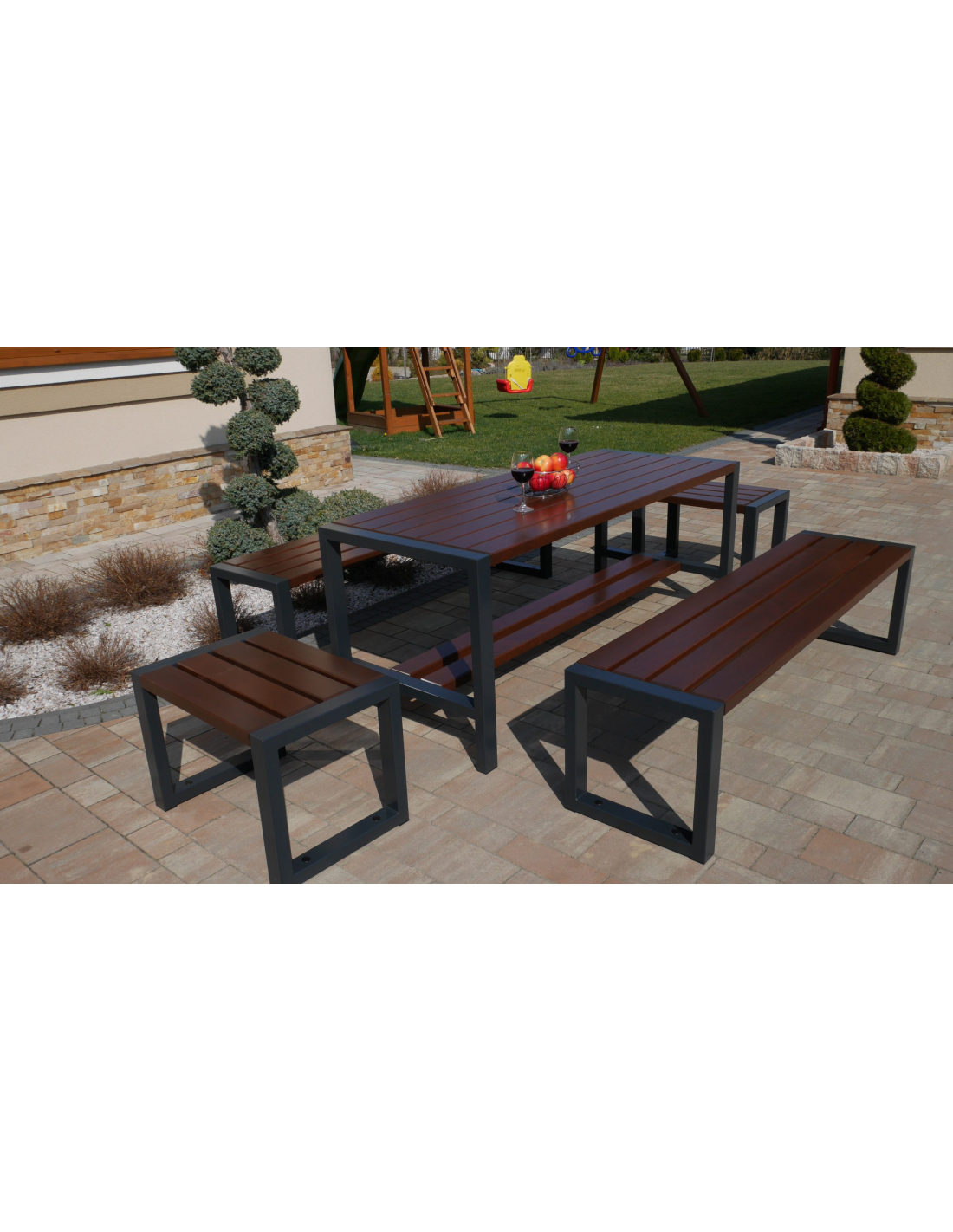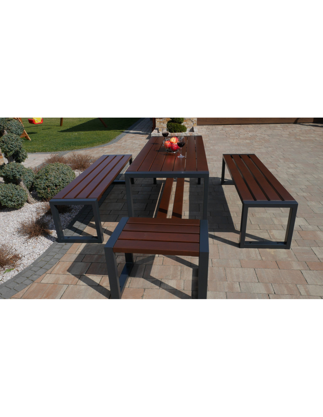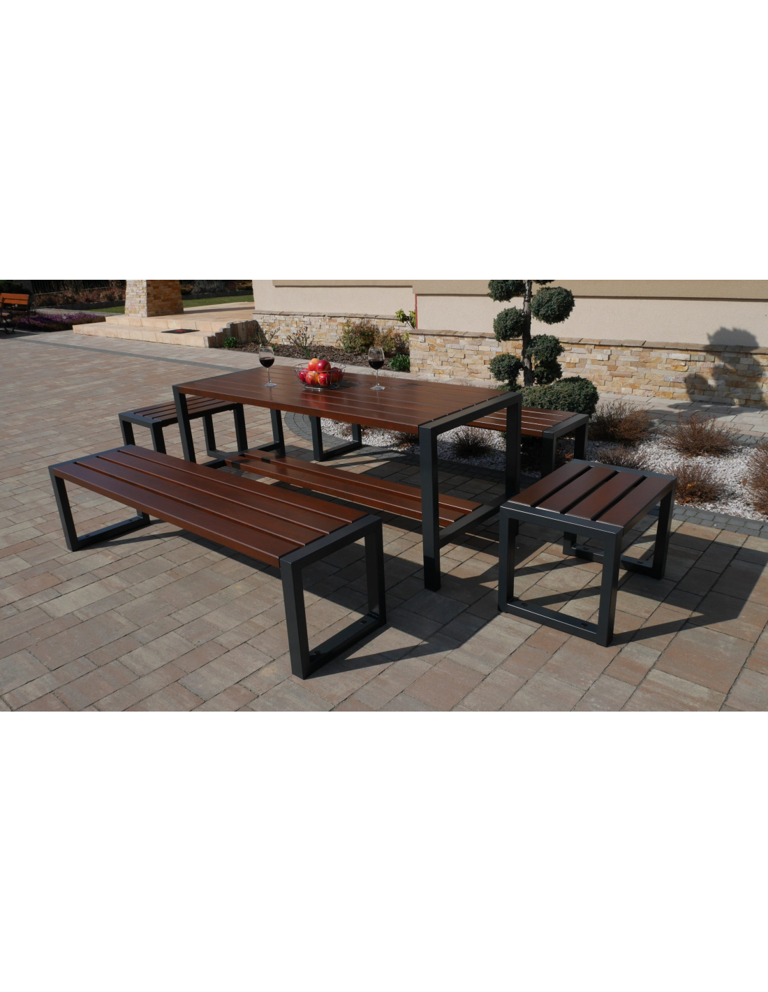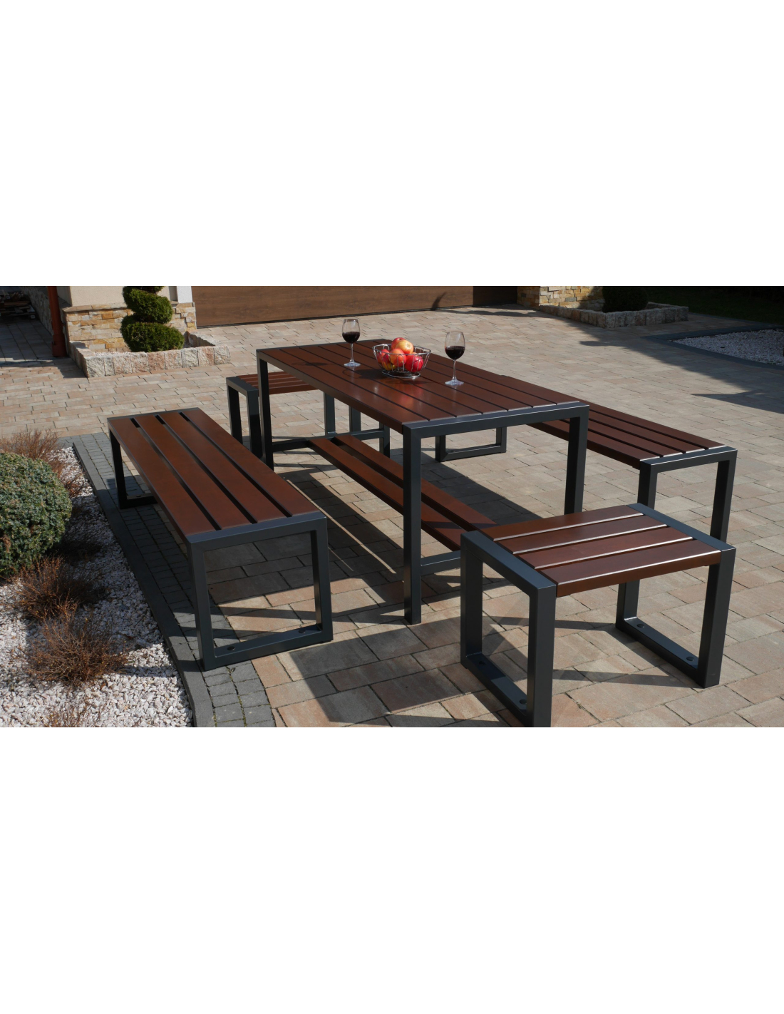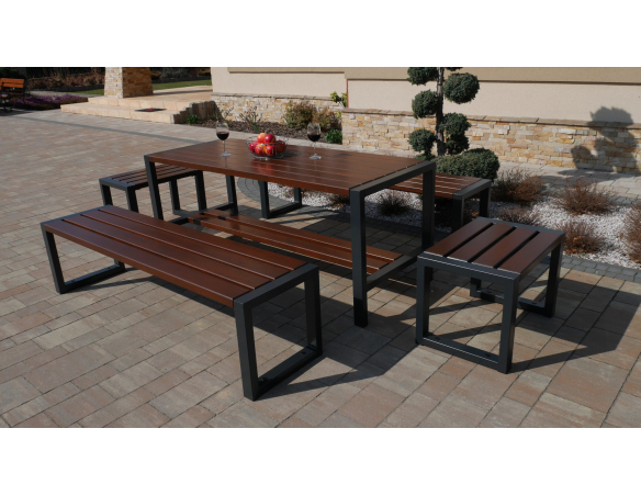 Dieses Set enthält einen Tisch, zwei Bänke und zwei Stühle ohne Rückenlehne und Armlehnen.