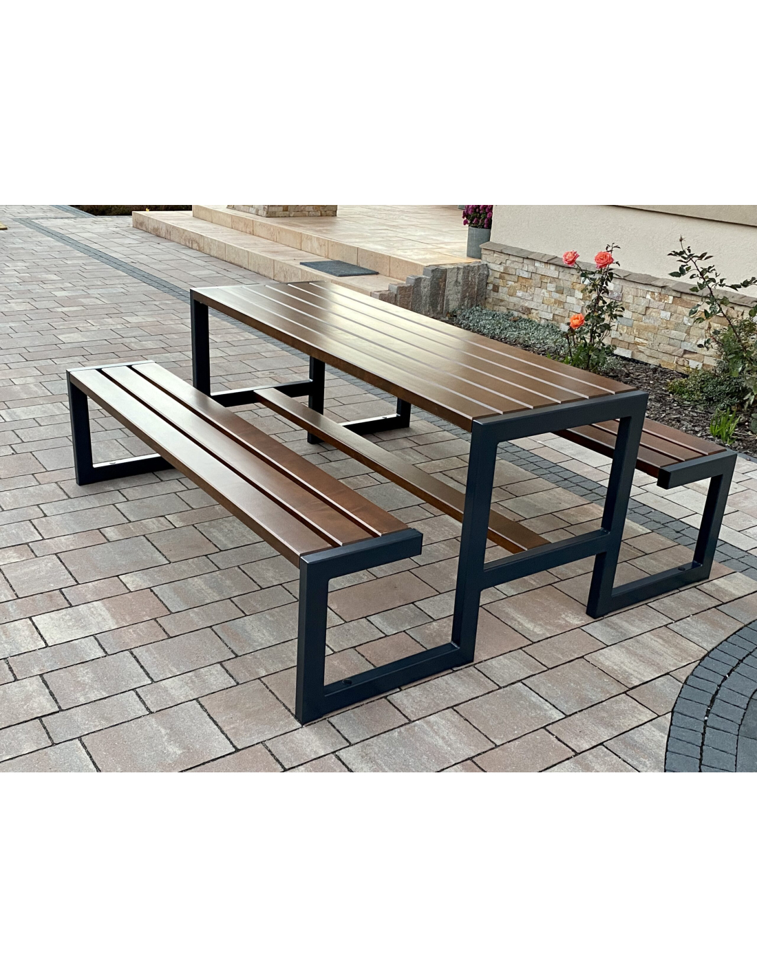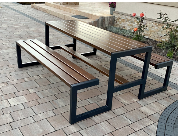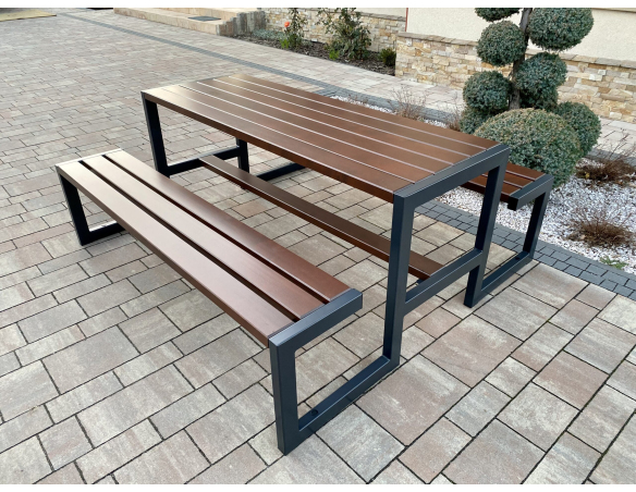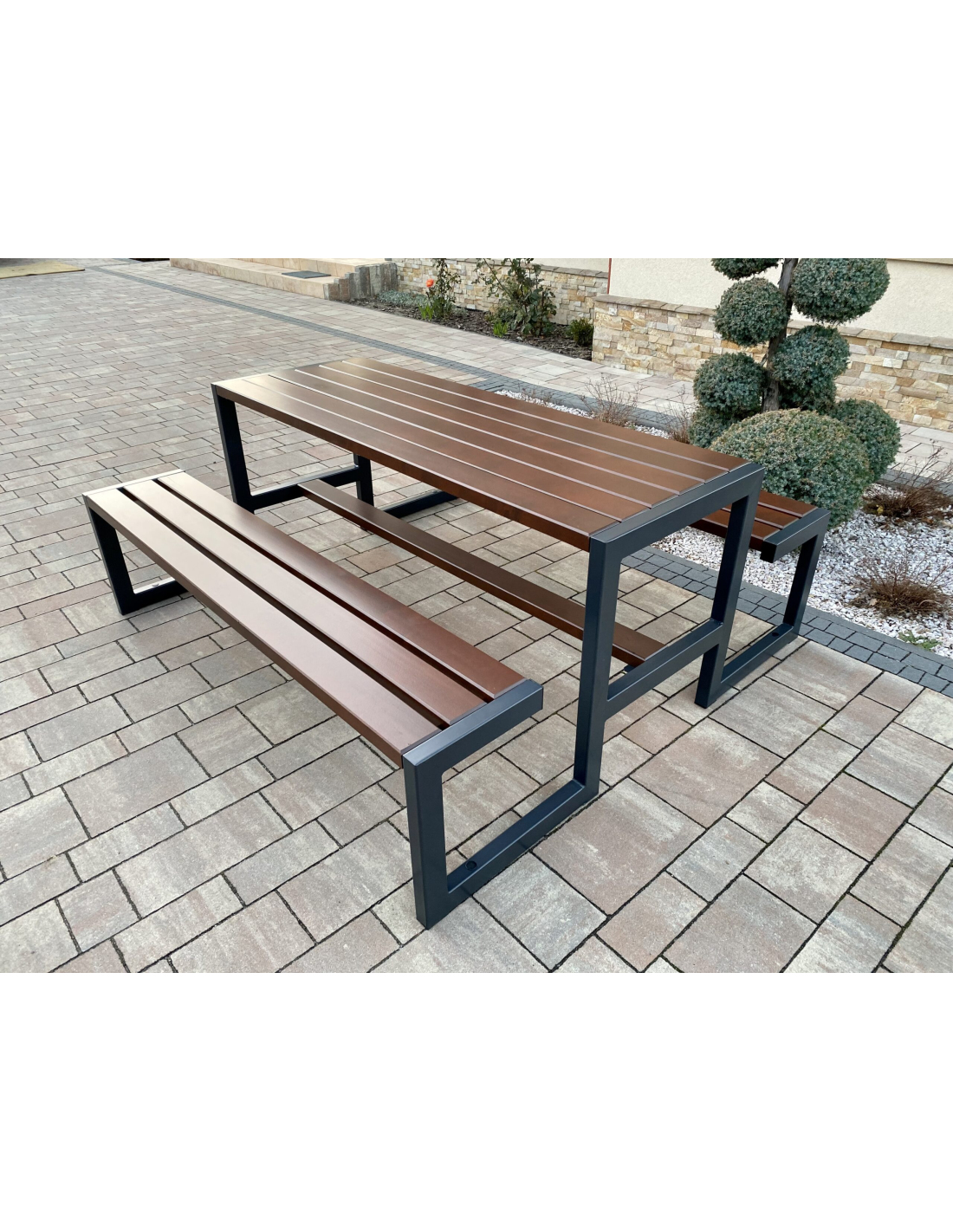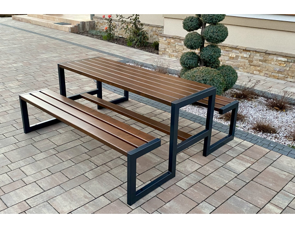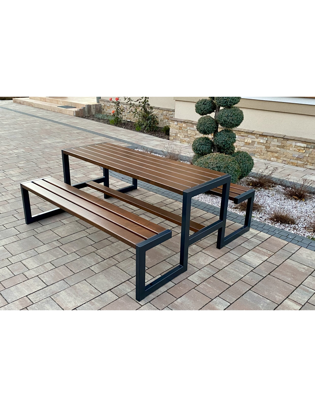 Dieses Set enthält zwei Bänke und Tisch fest miteinander verbunden ohne Rückenlehne und Armlehnen.