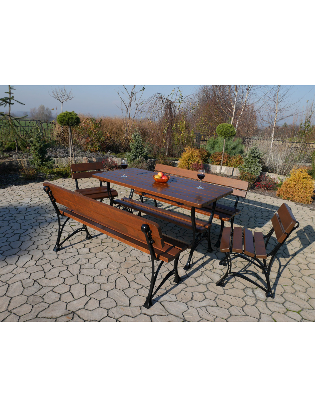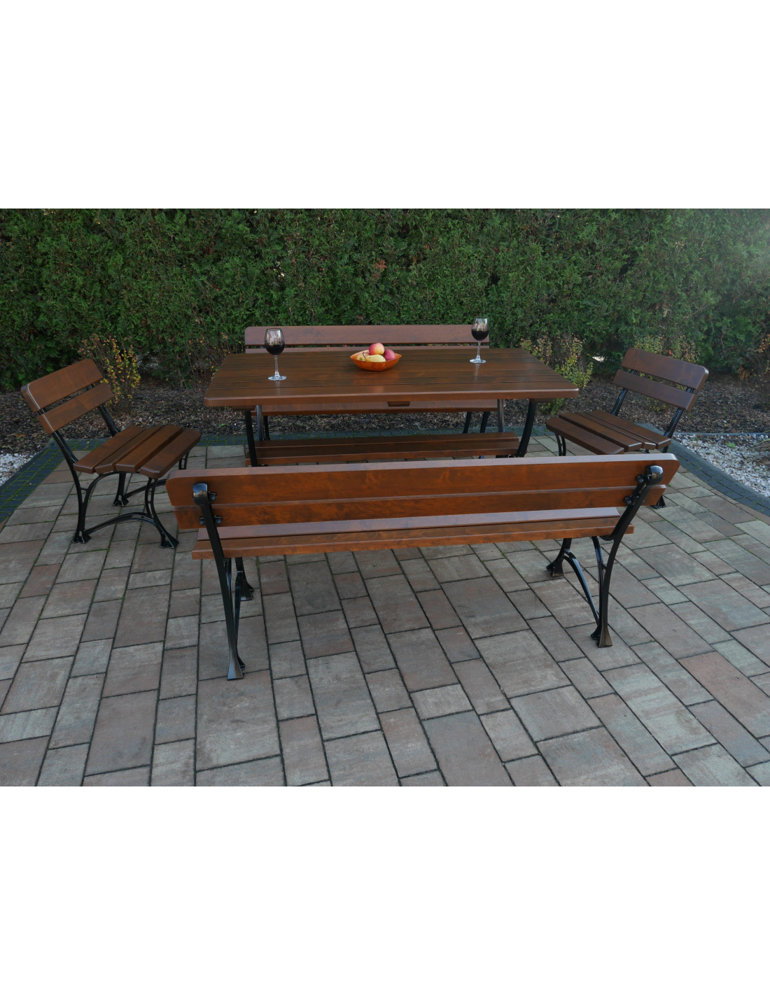 Dieses Set enthält einen Tisch, zwei Bänke und zwei Stühle mit Rückenlehne, ohne Armlehnen.