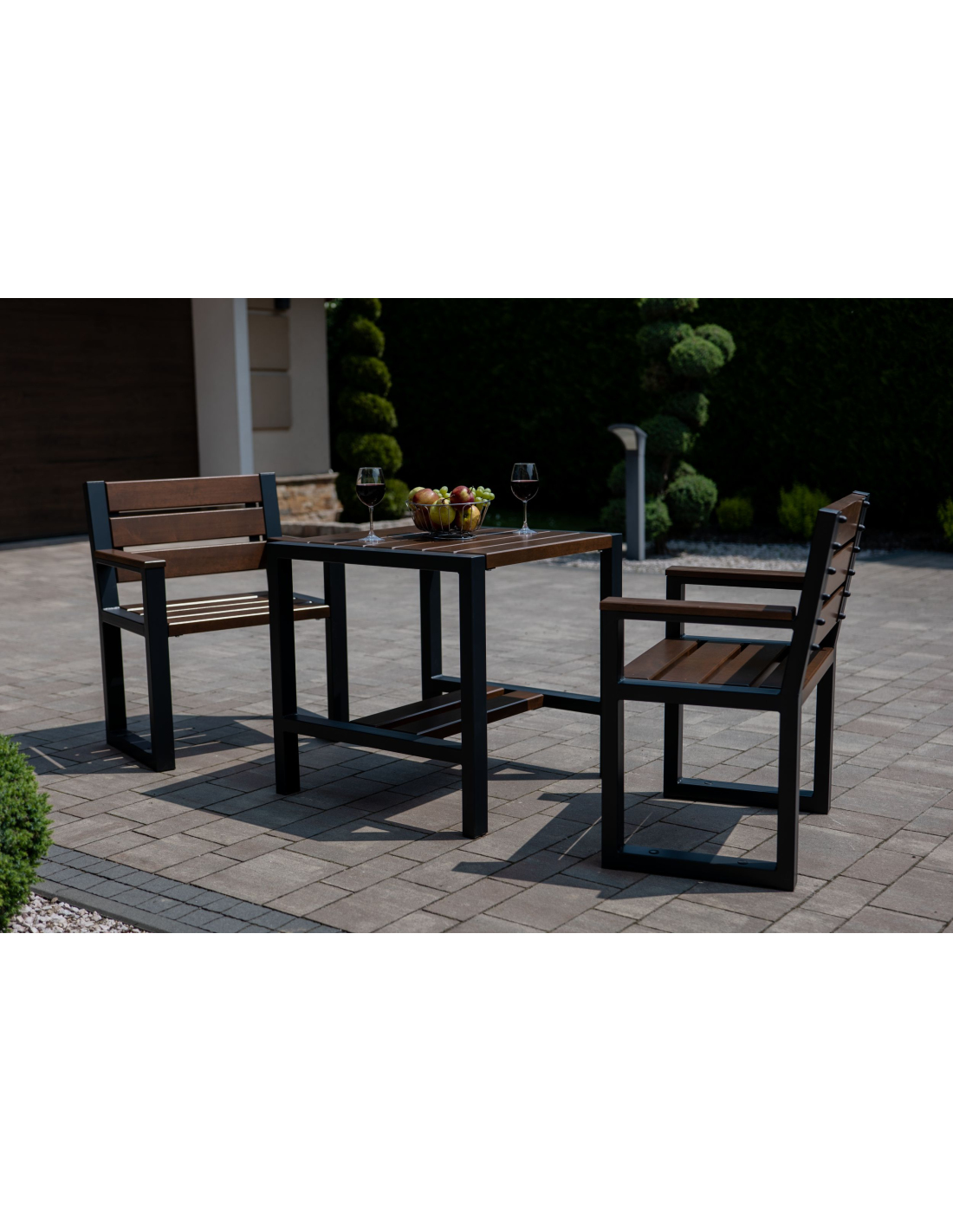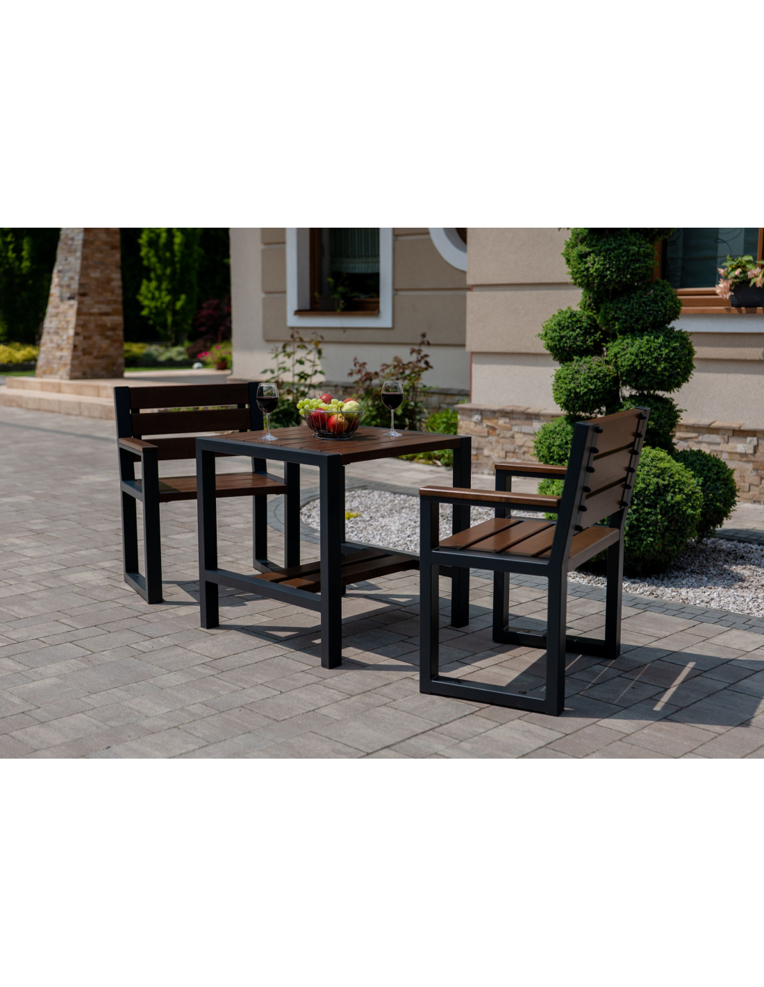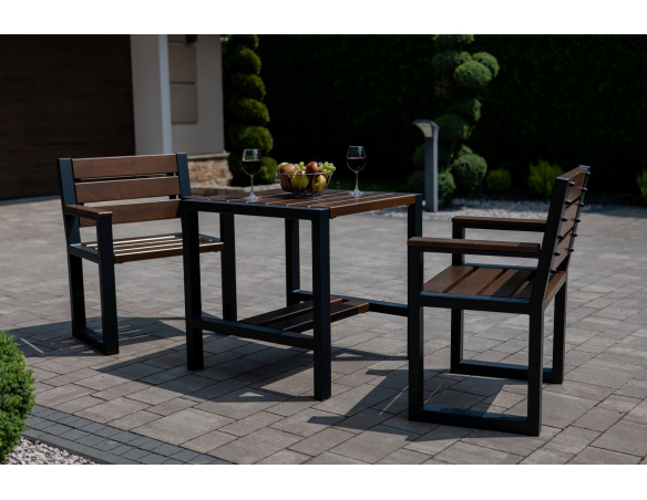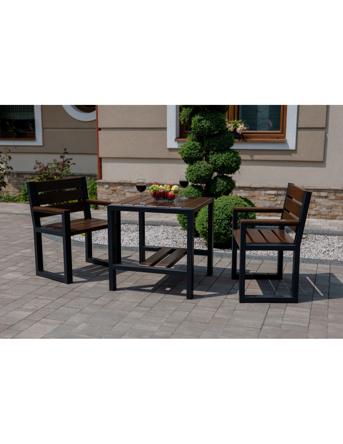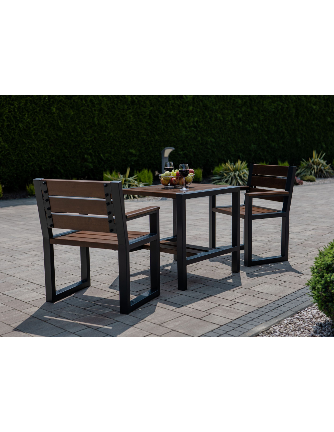 Dieses Set enthält einen Tisch und zwei Stühle mit Rückenlehne und Armlehnen.