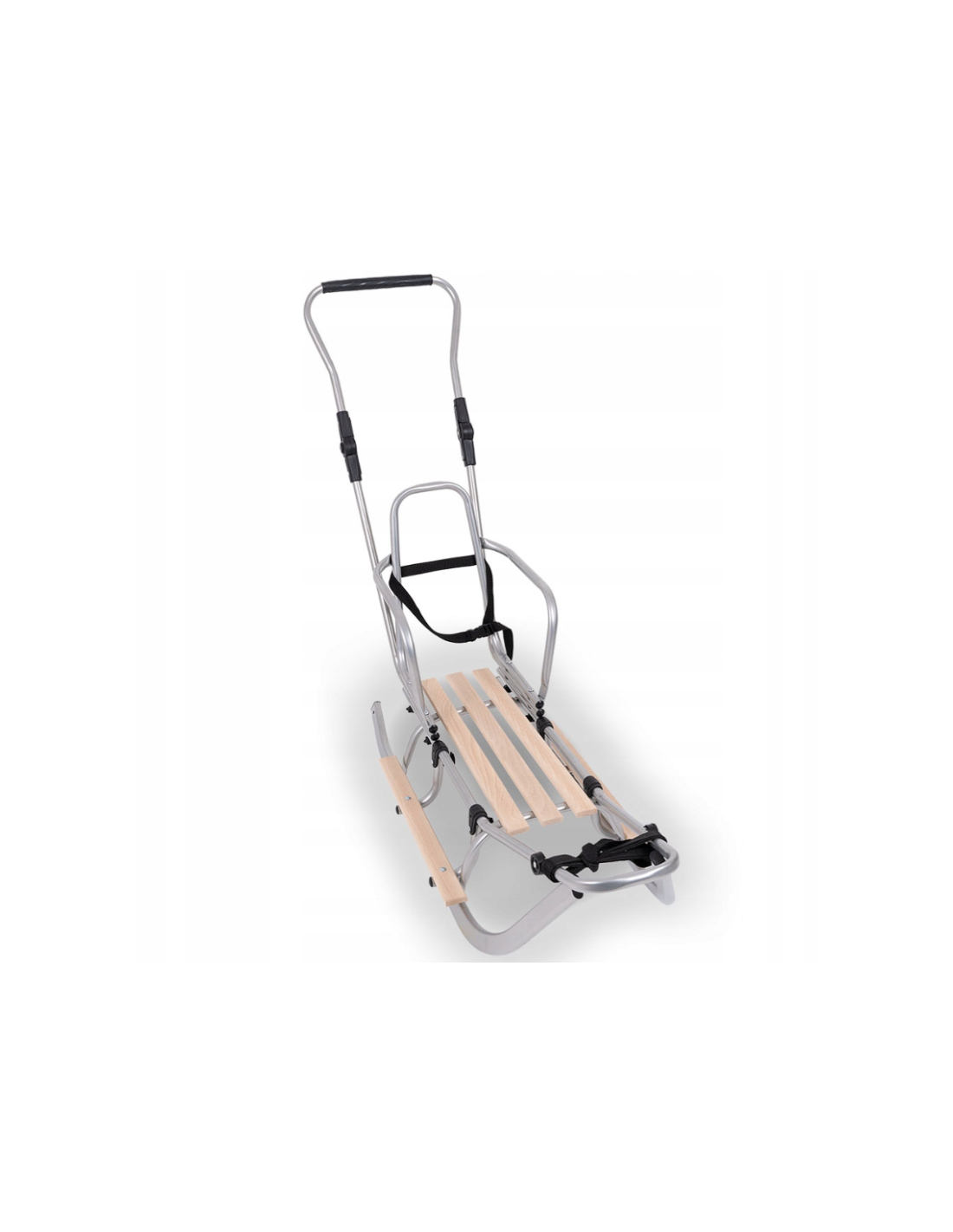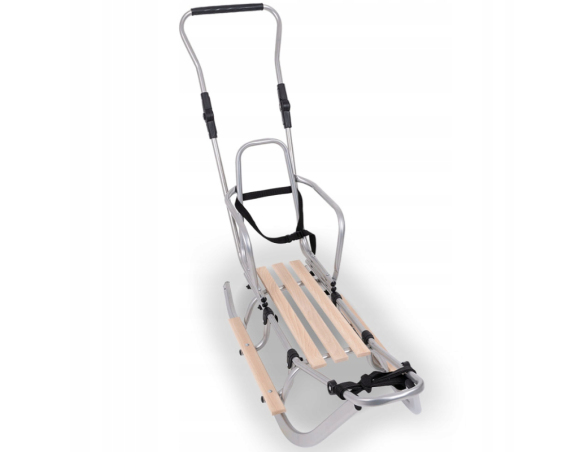 Die Rückenlehne ist mit einem Sicherheitsgurt ausgestattet, der mit einem Clip verschlossen wird. Der Schubbügel hat einen verstellbaren Griff für mehr Komfort. Die Schlitten lassen sich nach der Demontage des Zubehörs weiterhin nutzen, wenn die Kinder größer werden.