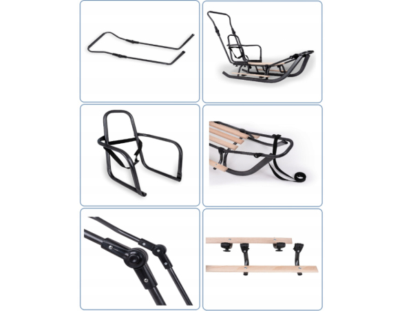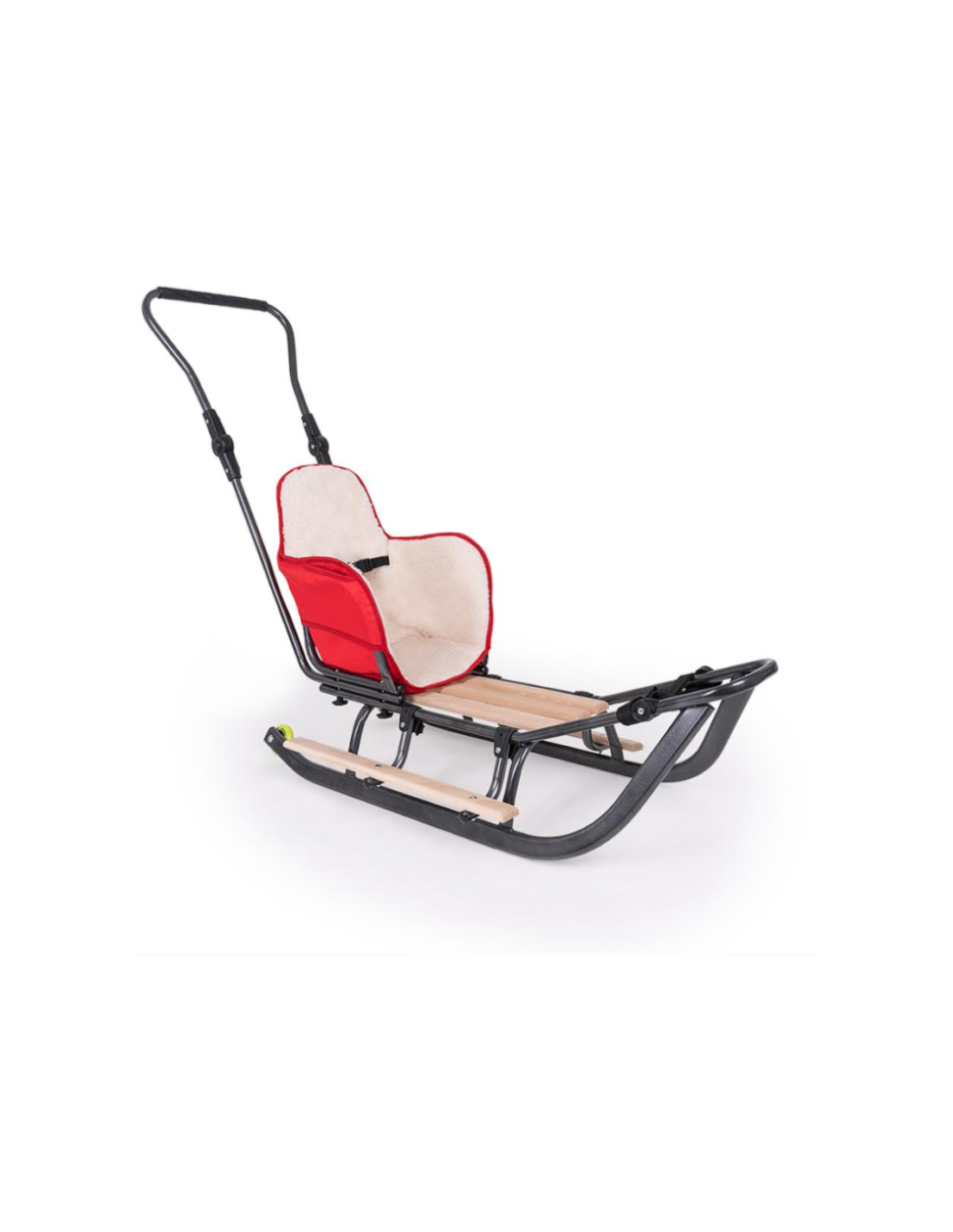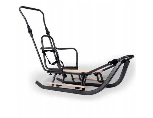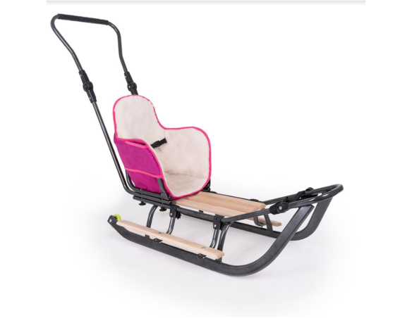Die Rückenlehne ist mit einem Sicherheitsgurt ausgestattet, der mit einem Clip verschlossen wird. Der Schubbügel hat einen verstellbaren Griff für mehr Komfort. Nach der Demontage des zusätzlichen Zubehörs können die Schlitten weiterhin genutzt werden, wenn die Kinder größer sind.
