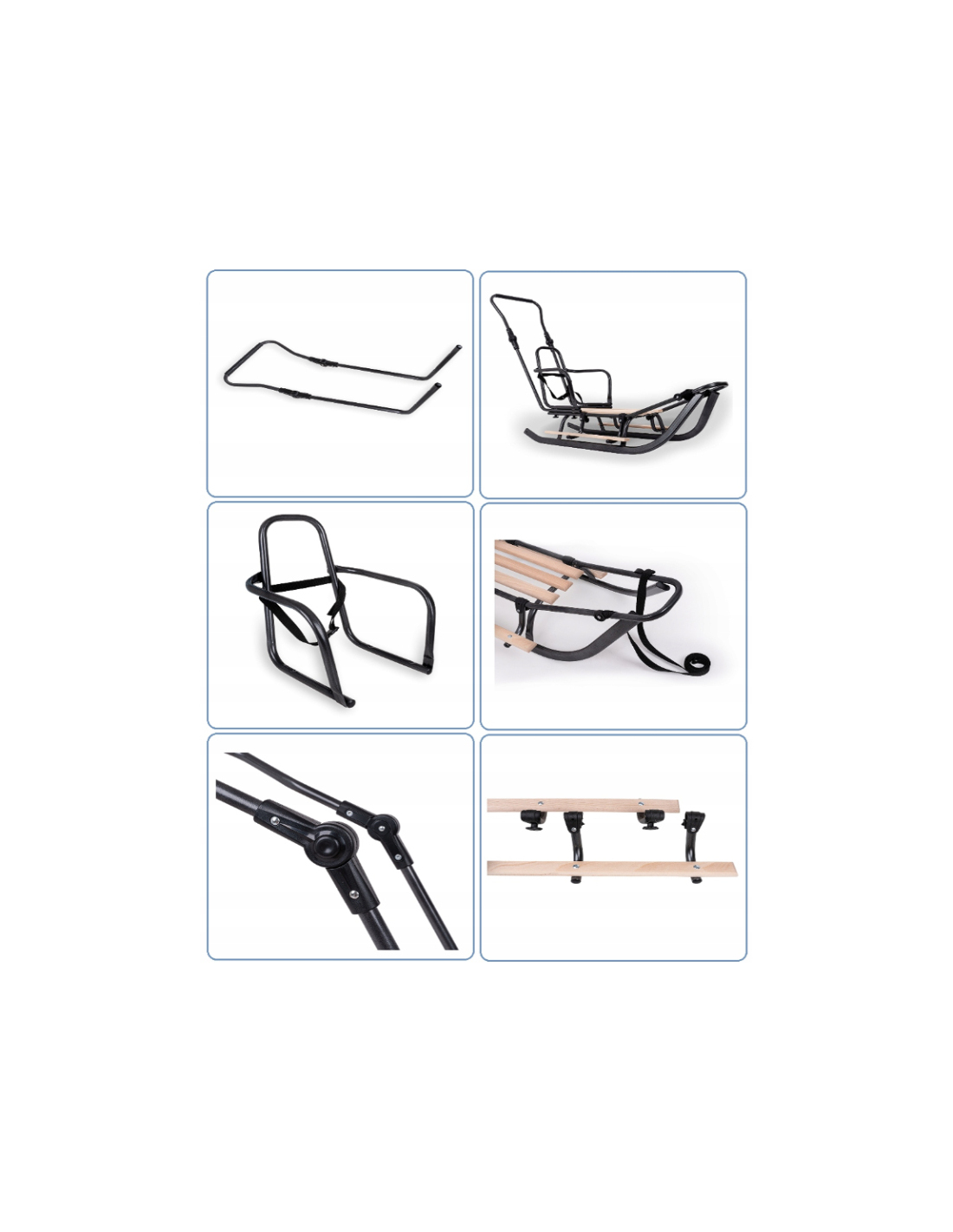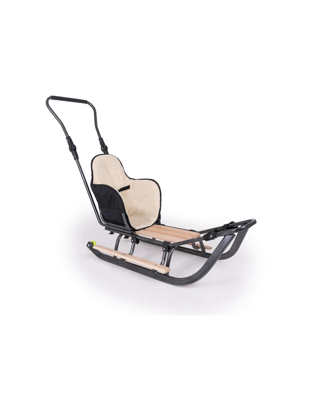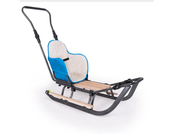 Die Rückenlehne ist mit einem Sicherheitsgurt ausgestattet, der mit einem Clip verschlossen wird. Der Schubbügel hat einen verstellbaren Griff für mehr Komfort. Nach der Demontage des zusätzlichen Zubehörs können die Schlitten weiterhin genutzt werden, wenn die Kinder größer sind.