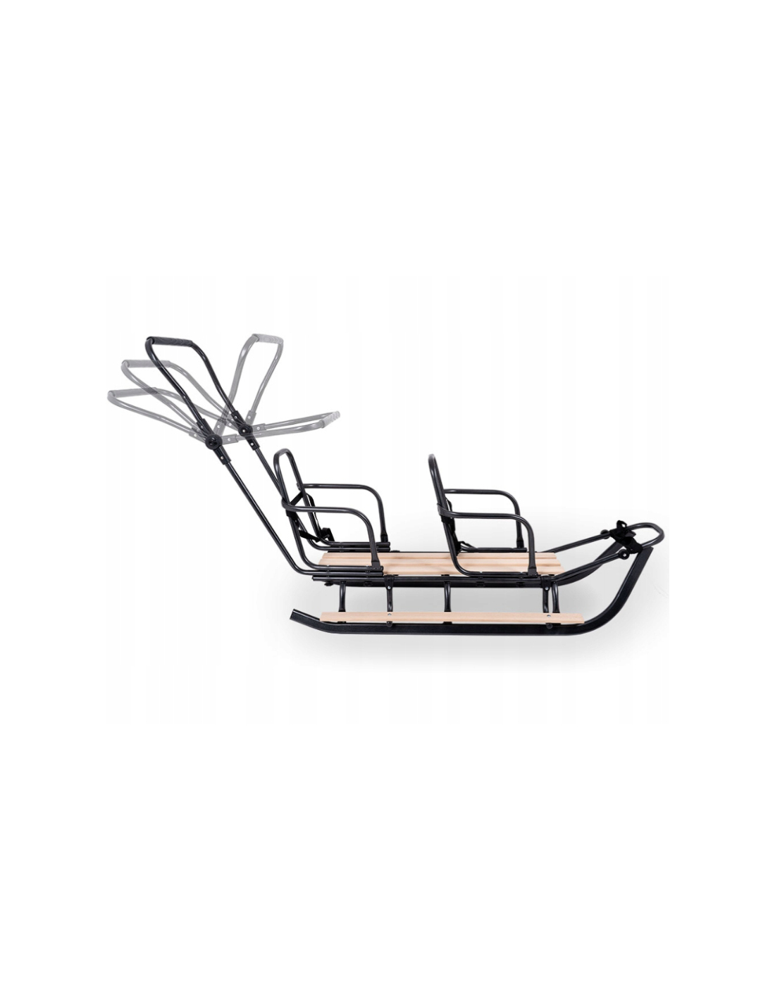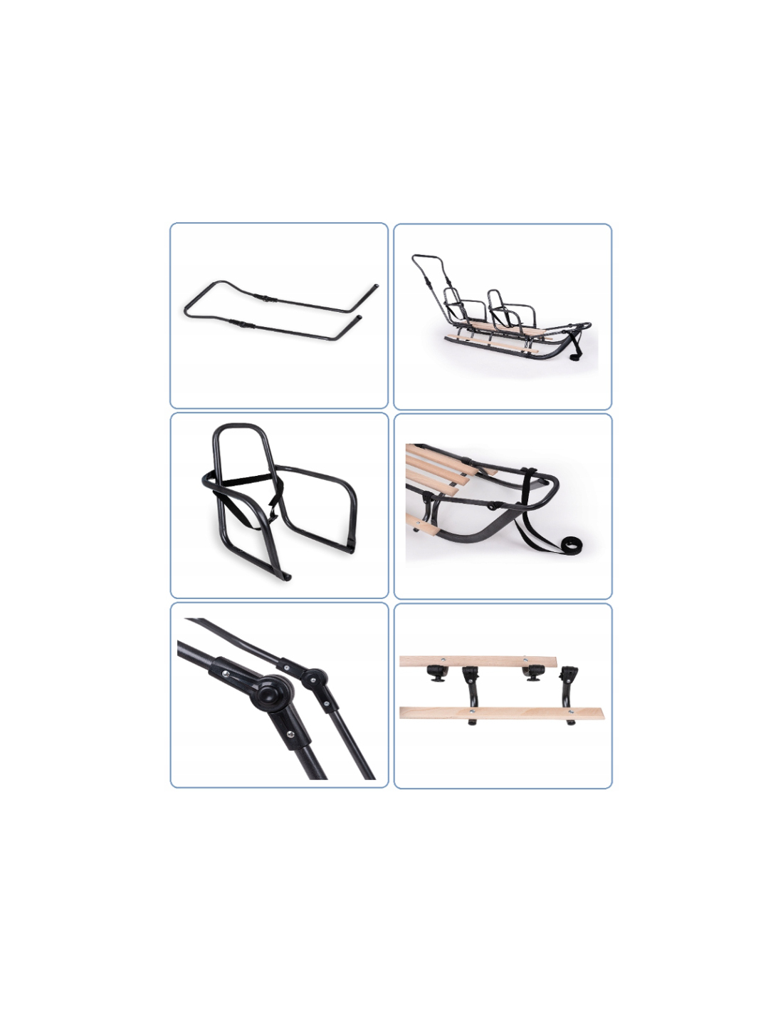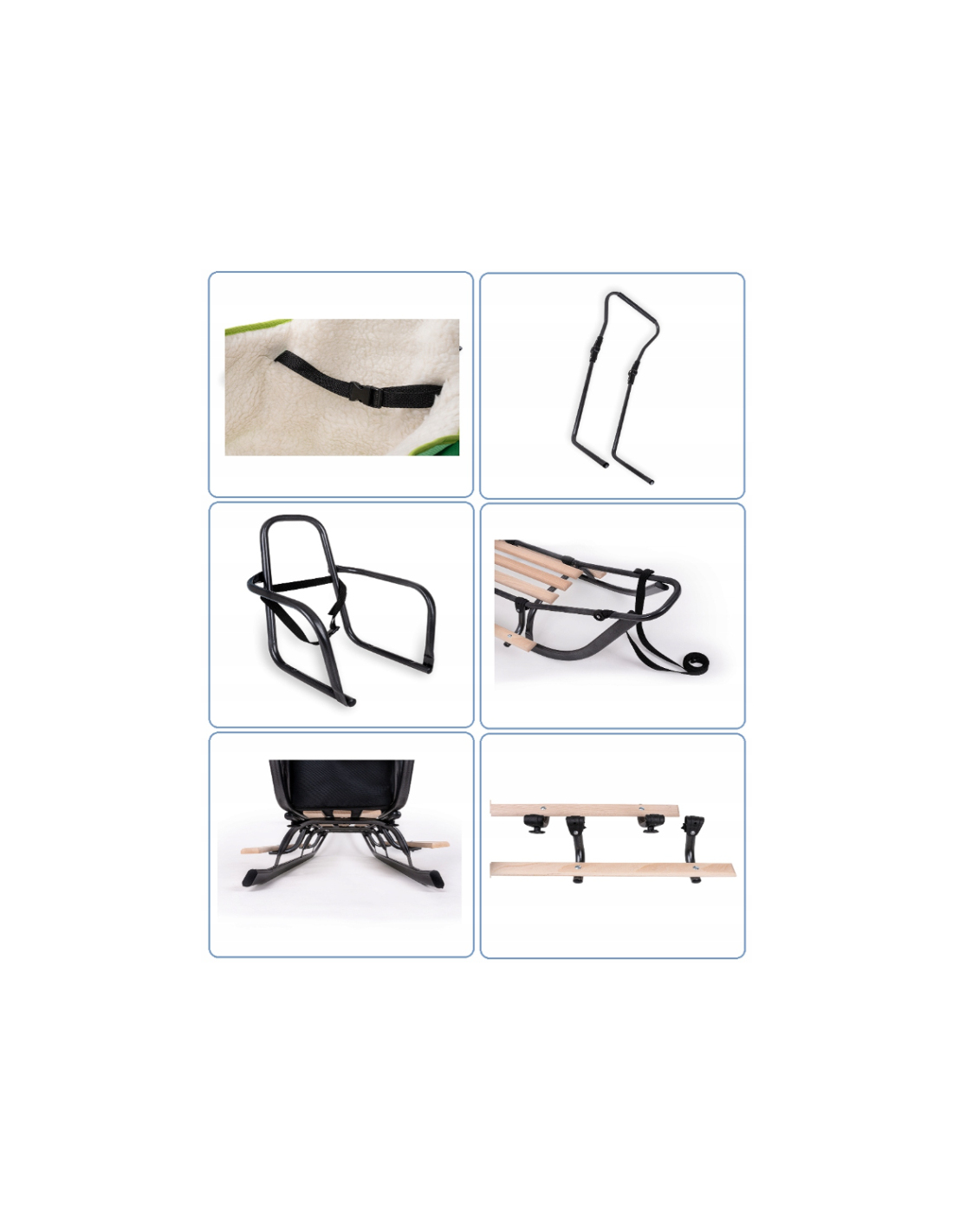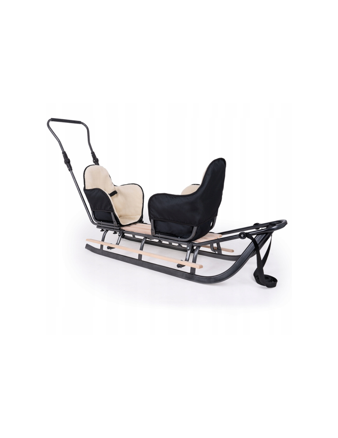 Die Rückenlehne ist mit einem Sicherheitsgurt ausgestattet, der mit einem Clip verschlossen wird. Der Schubbügel hat einen verstellbaren Griff für mehr Komfort. Nach der Demontage des zusätzlichen Zubehörs können die Schlitten weiterhin genutzt werden, wenn die Kinder größer sind.