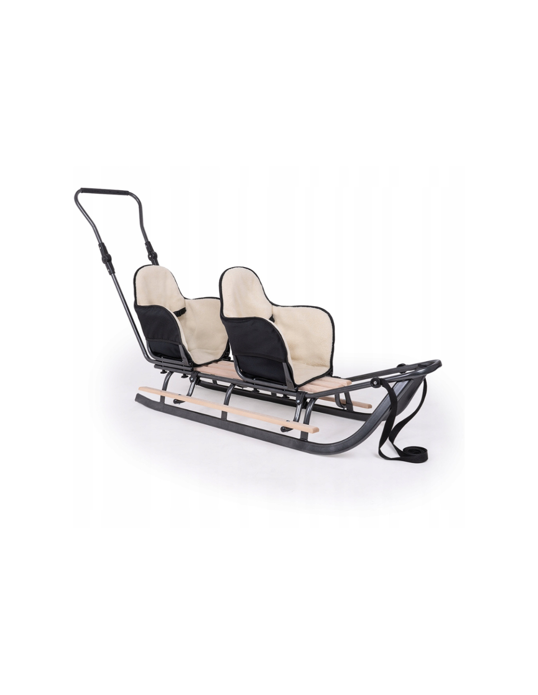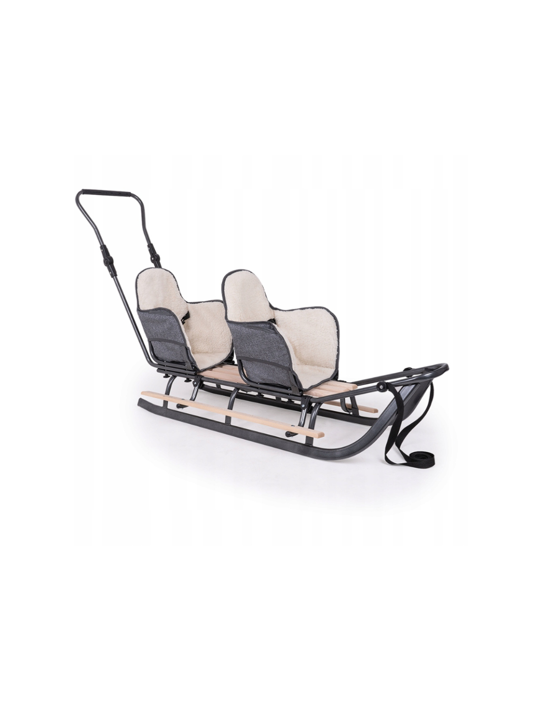 Multifunktionale Doppelschlitten ausgestattet mit Schubbügel, warme und weiche Sitzkissen aus Fleece und Fußablagen.