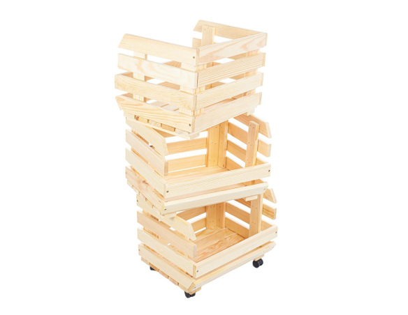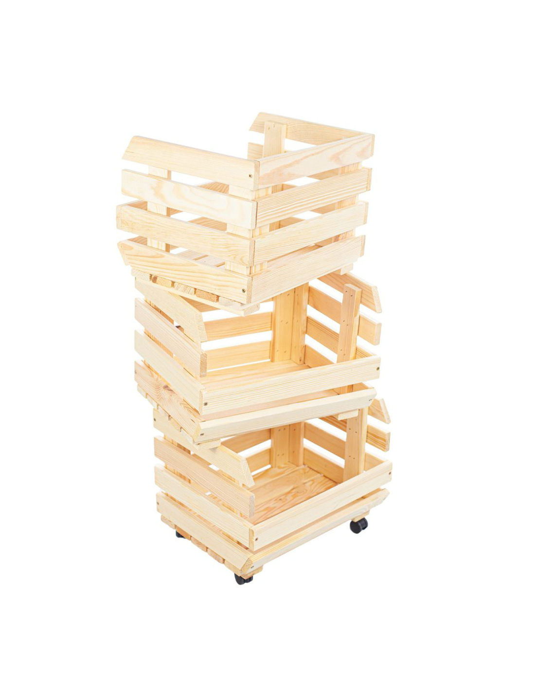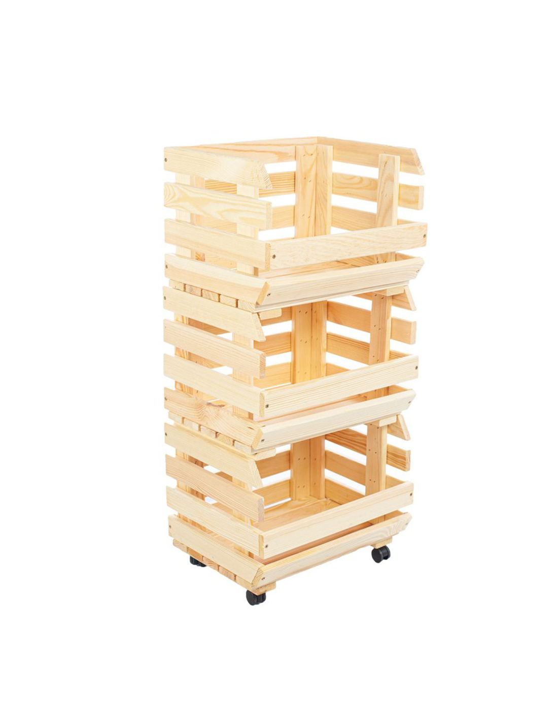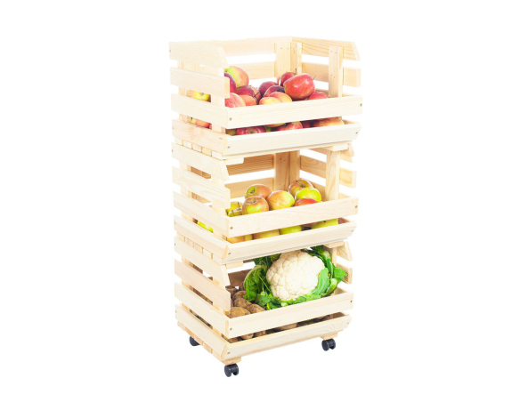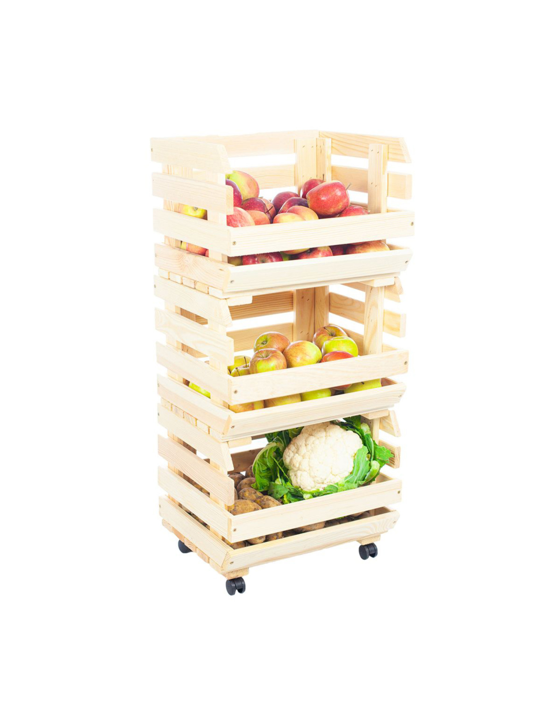 Holzkiste für Gemüse und Obst im rustikalen Stil. Perfekt zur Aufbewahrung von Lebensmitteln in der Küche, Speisekammer, im Keller oder in der Garage. Gefertigt aus Holz mit natürlicher Oberfläche, vereint sie Funktionalität und Ästhetik. Die robuste Konstruktion gewährleistet Langlebigkeit im täglichen Gebrauch. Das Set enthält drei stapelbare Regale, und die mitgelieferten Räder ermöglichen ein einfaches Bewegen der Kisten im Raum.
