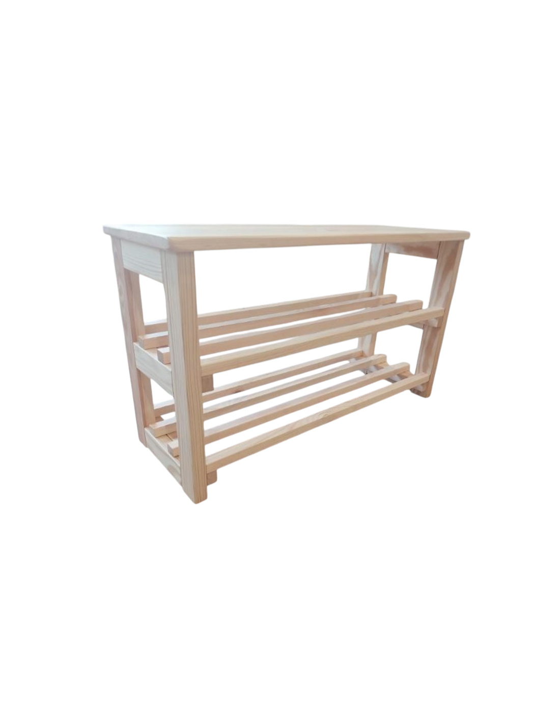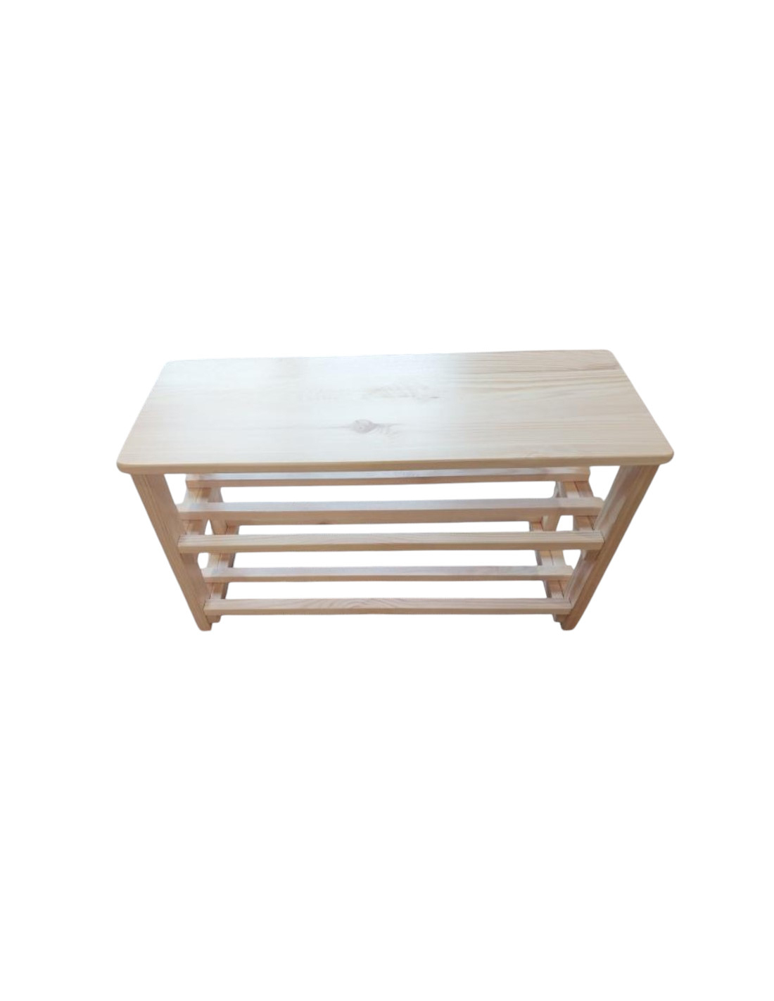 Das Schuhregal besteht aus natürlichem Kiefernholz, das mit einem klaren Lack versiegelt wurde. Dadurch behält es seine helle, natürliche Holzfarbe und die sichtbare Maserung bei, was ihm ein ästhetisches und minimalistisches Aussehen verleiht. Die Konstruktion ist stabil und robust, was eine lange Lebensdauer garantiert.