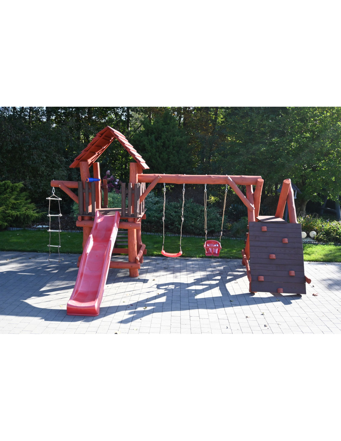 Massivholz Spielturm THEO Klettergerüst Kletterturm Kletterwand Rutsche Schaukel Strickleiter Spielplatz im Garten