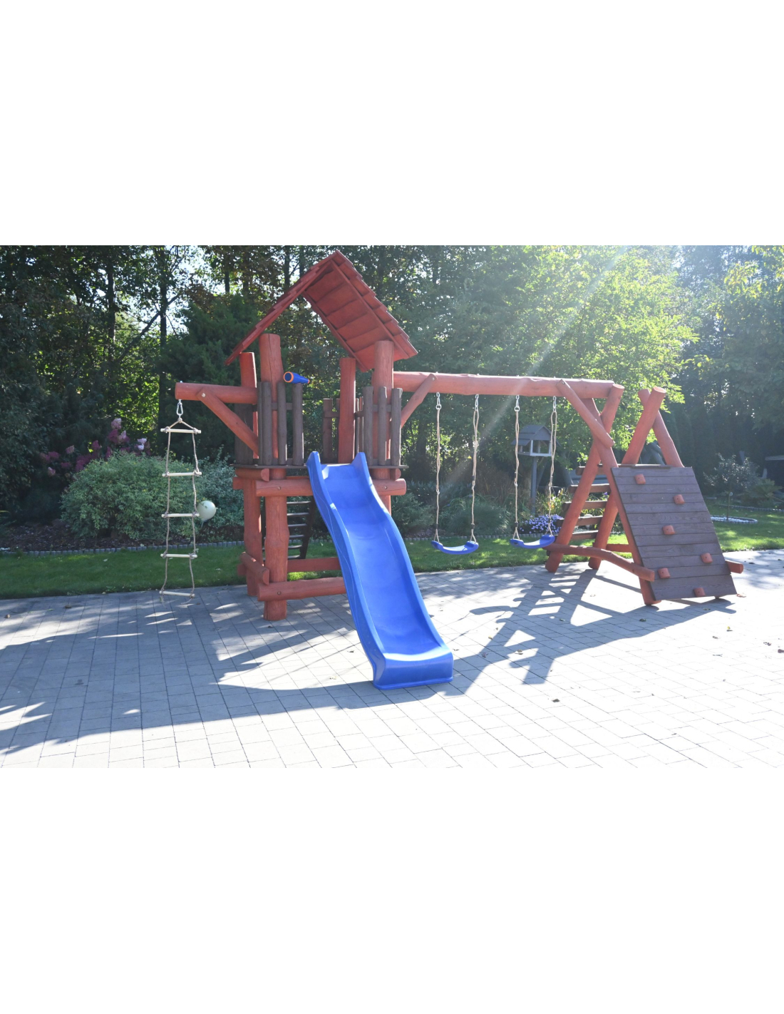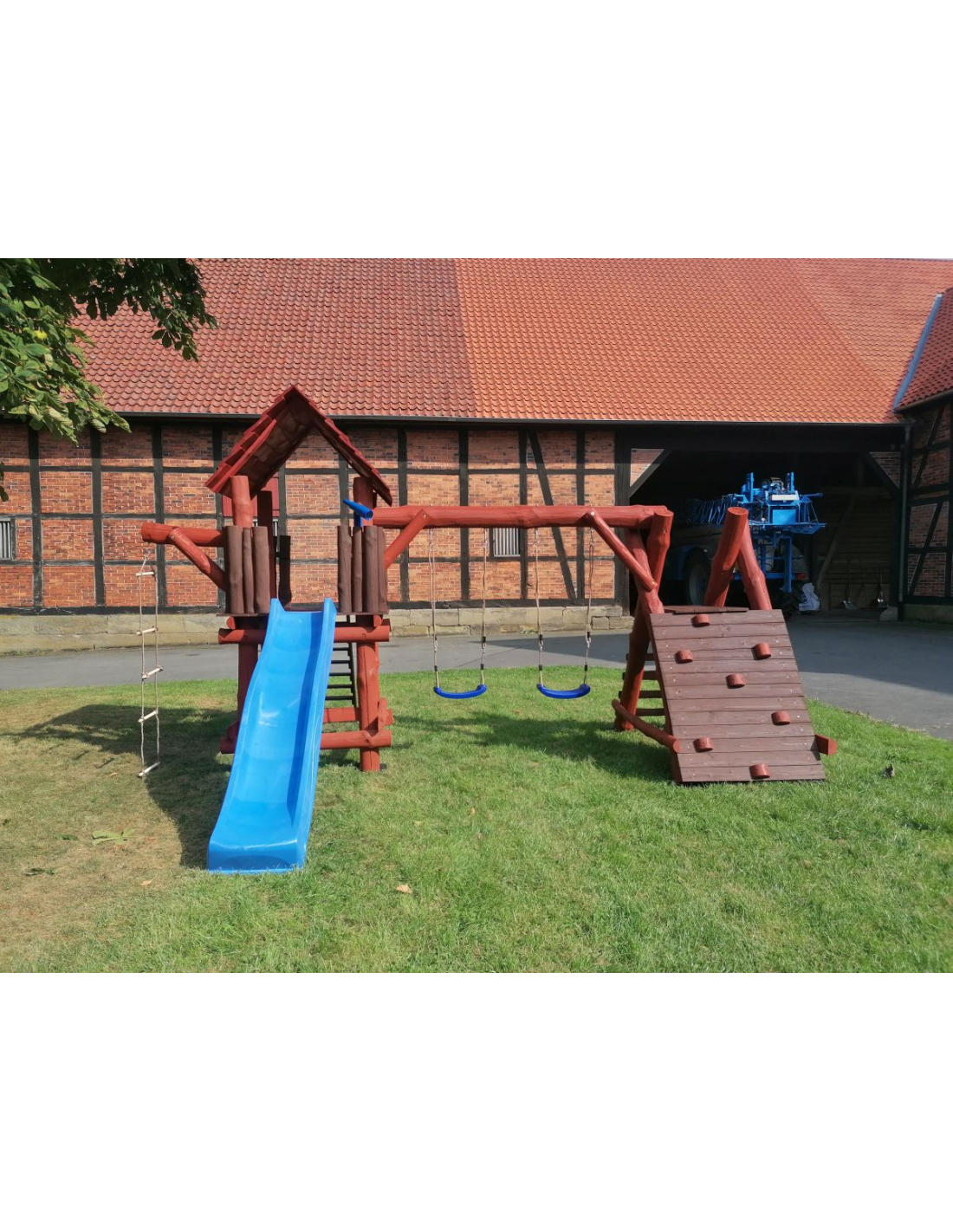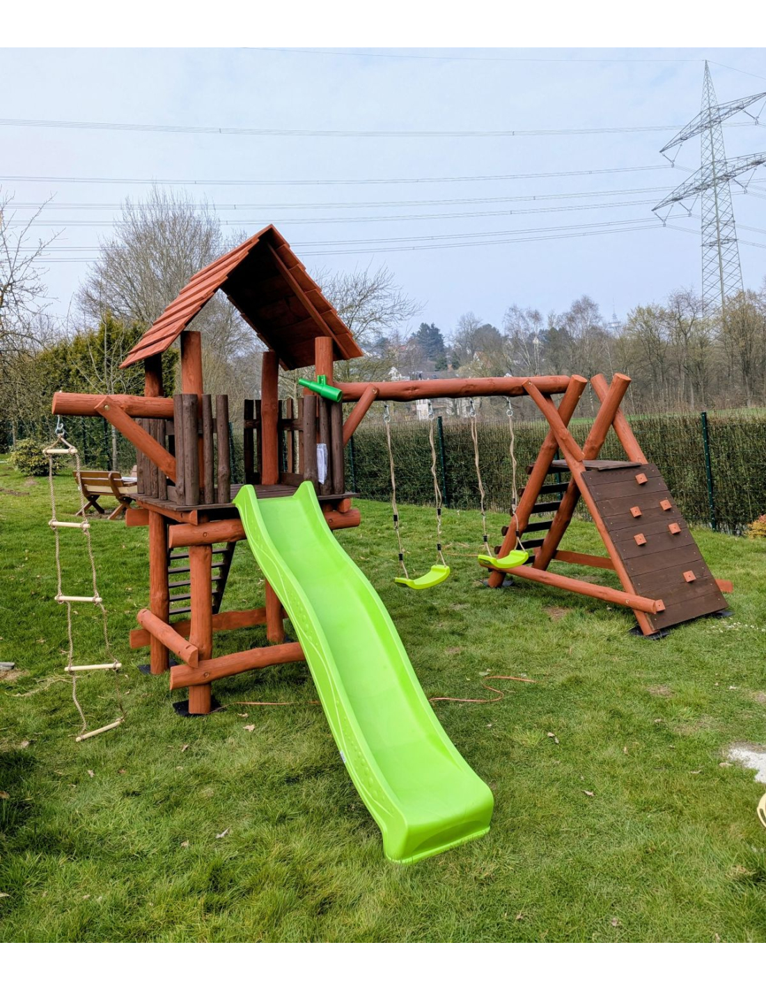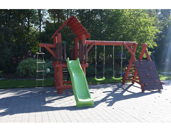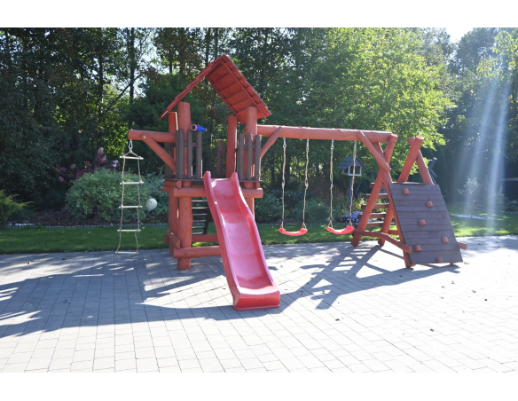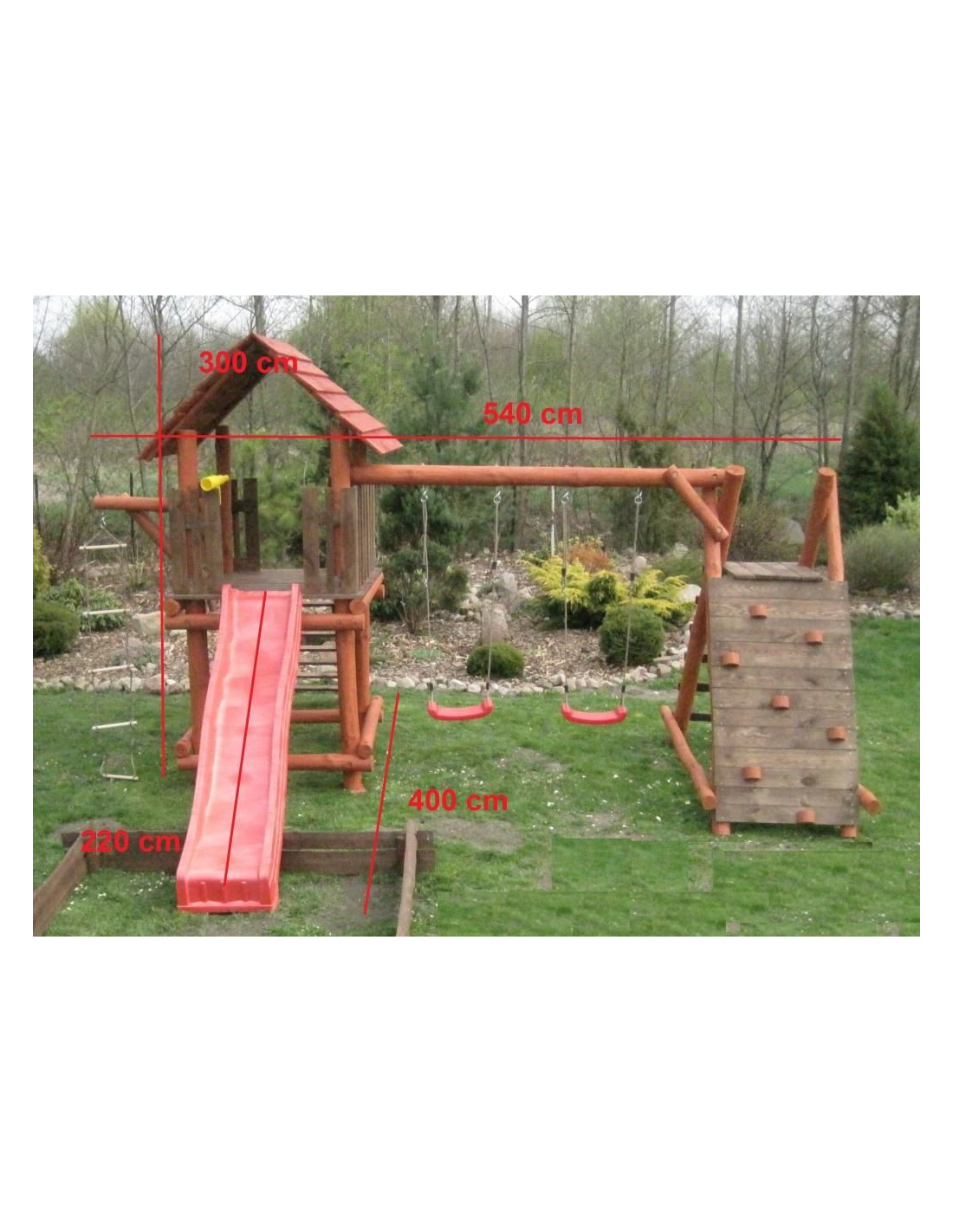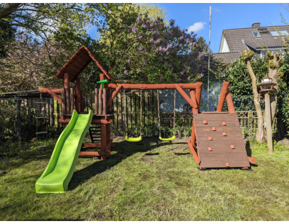 - (LxBxH): 540 cm x 400 cm x 290 cm (Die Gesamtabmessungen können eine Toleranz von etwa 20–30 cm aufweisen. Die Maße hängen von der Dicke der Balken ab, aus denen wir die Spieltürme herstellen. Die Balken haben eine natürliche, unregelmäßige Form)