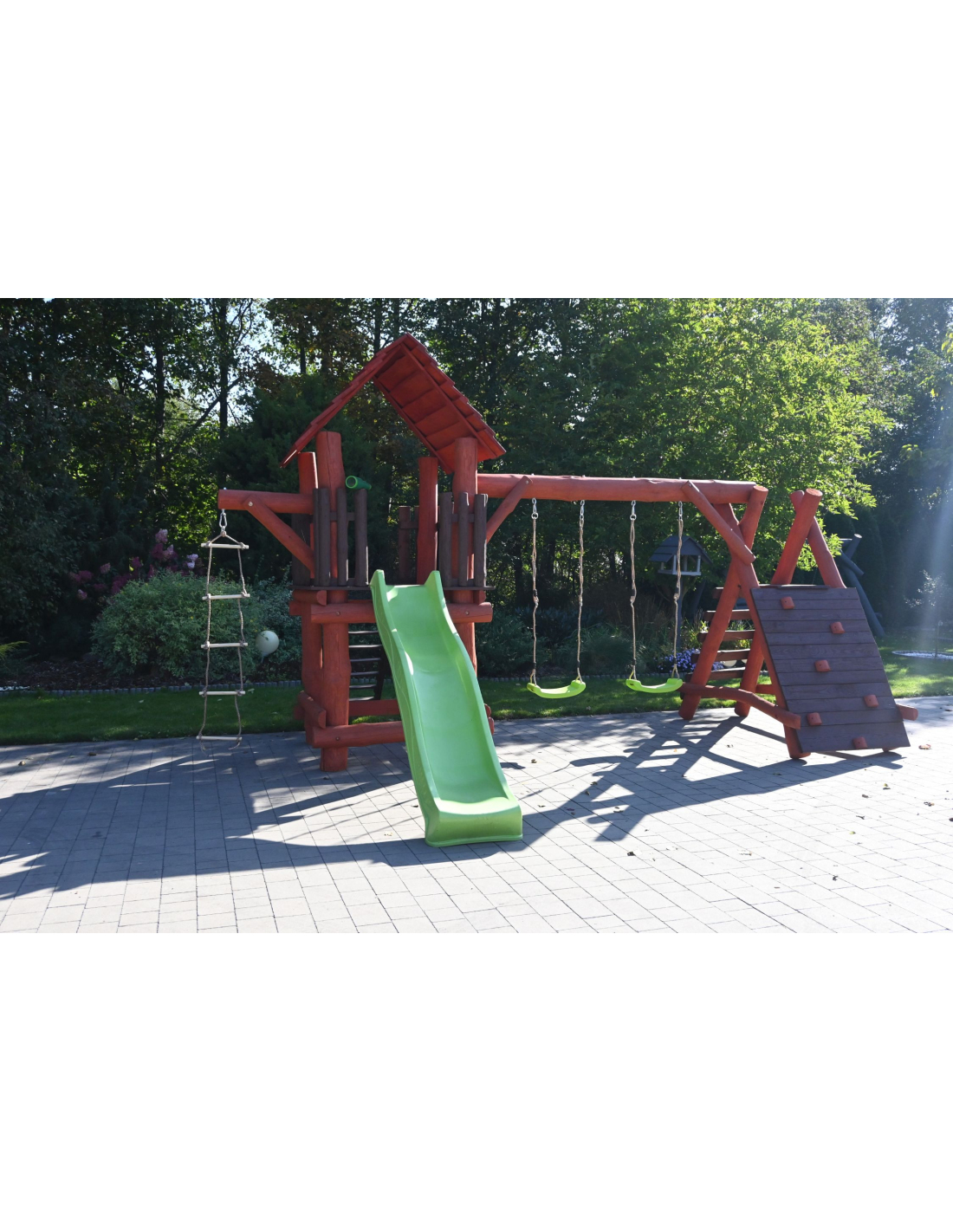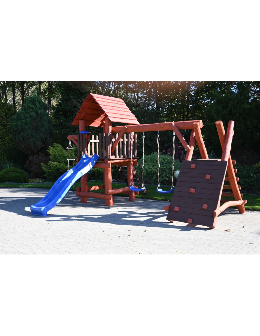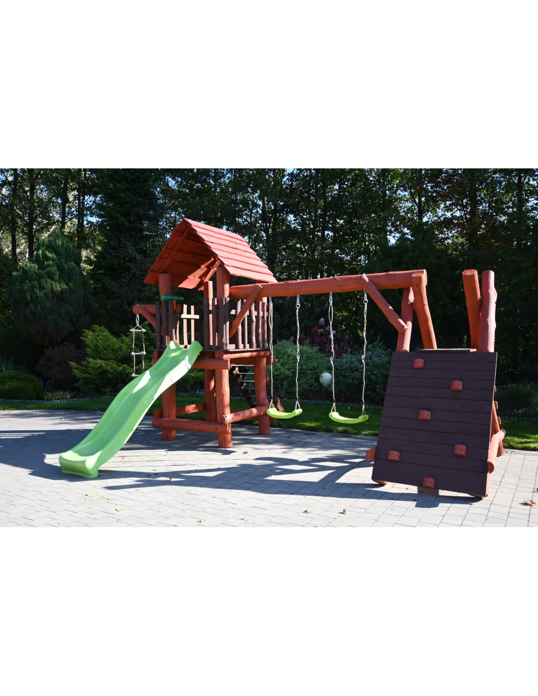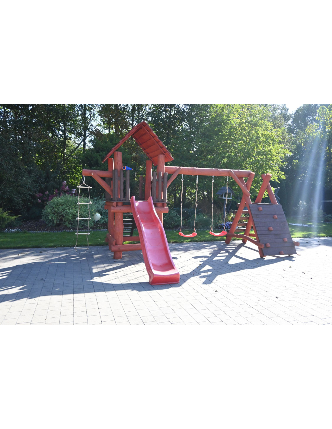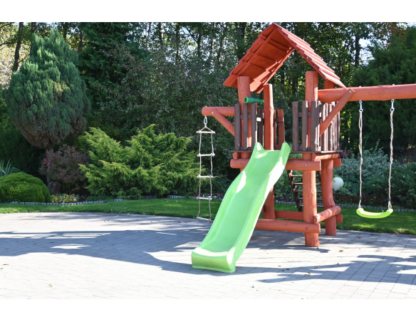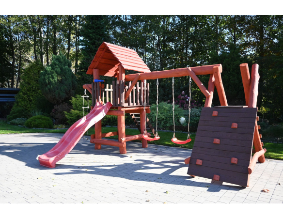 - (LxBxH): 540 cm x 400 cm x 290 cm (Die Gesamtabmessungen können eine Toleranz von etwa 20–30 cm aufweisen. Die Maße hängen von der Dicke der Balken ab, aus denen wir die Spieltürme herstellen. Die Balken haben eine natürliche, unregelmäßige Form)
