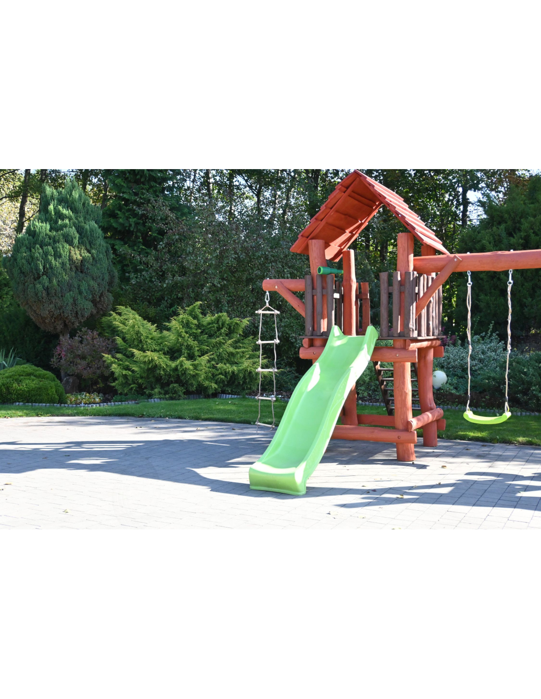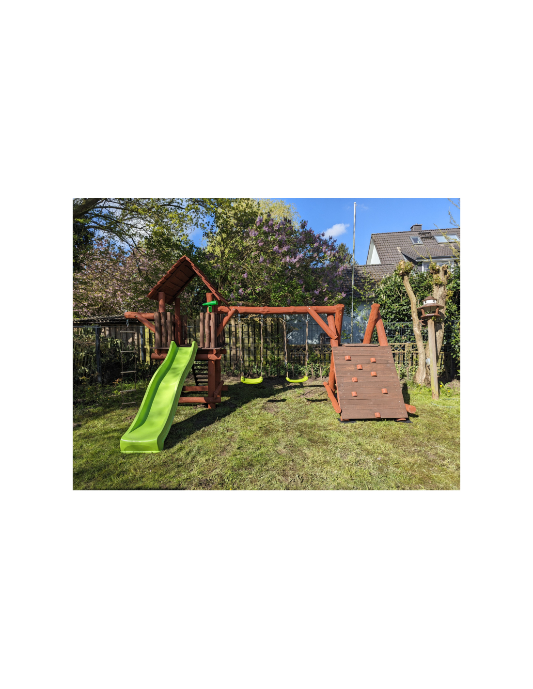 Unsere Spieltürme mit Holzhäuschen werden in einem Stück geliefert, wiegen etwa 200 kg und benötigen einen Durchgang von mindestens ca. 135 cm Breite (z. B. Gartentor, Zaun, Weg).Wenn Sie unsicher sind, ob der Transport des Spielgeräts in Ihren Garten möglich ist – kontaktieren Sie uns bitte!