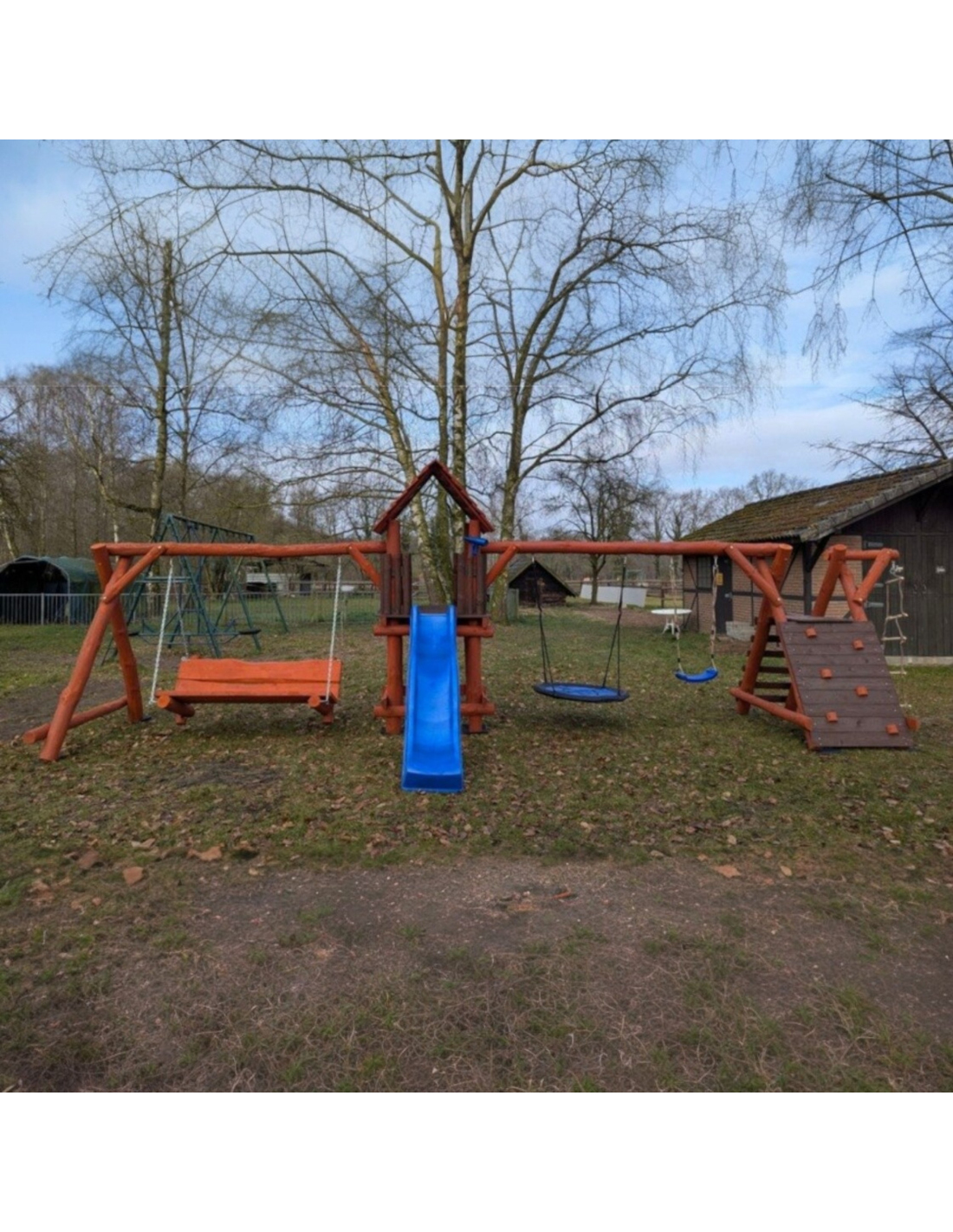 Massivholz Spielturm JONAS Klettergerüst Kletterturm Kletterwand Rutsche Hollywoodschaukel Nestschaukel Schaukel Spielplatz