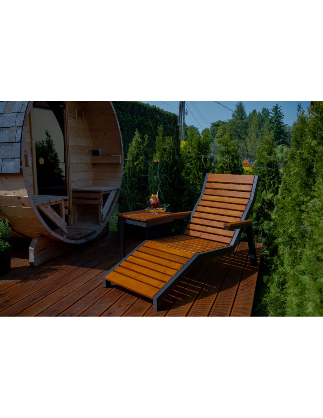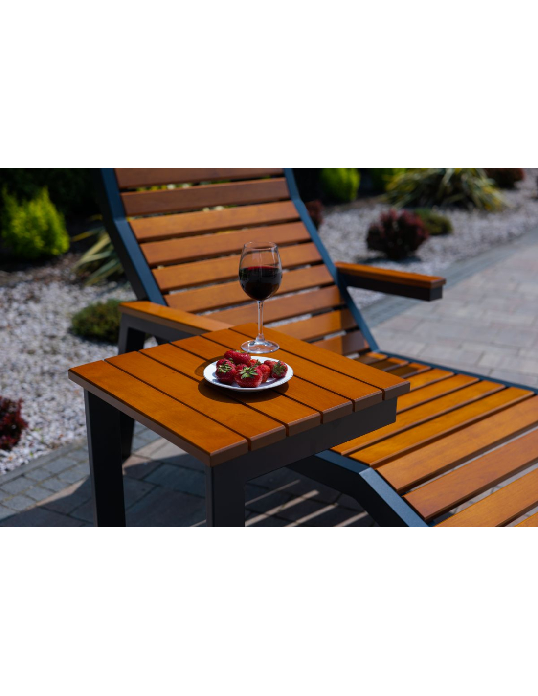 Der abgebildete Beistelltisch ist die perfekte Ergänzung zur Sonnenliege. Auch er besteht aus geöltem Erlenholz mit der gleichen Lackierung wie die Liege. Das Gestell ist aus schwarzem pulverbeschichtetem Metall gefertigt, wodurch er stabil und witterungsbeständig ist.