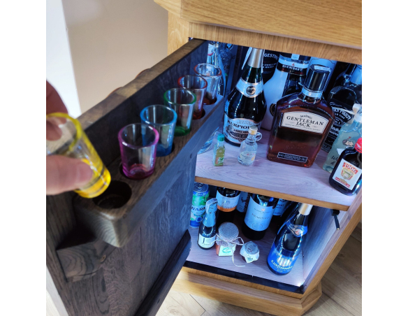 Jede Flaschenbar JACK wird aus hochwertigem, massivem Kiefernholz gefertigt und mit einer Beize in Eichenfarbe versiegelt, die das Holz zusätzlich schützt und seine natürliche Struktur betont.