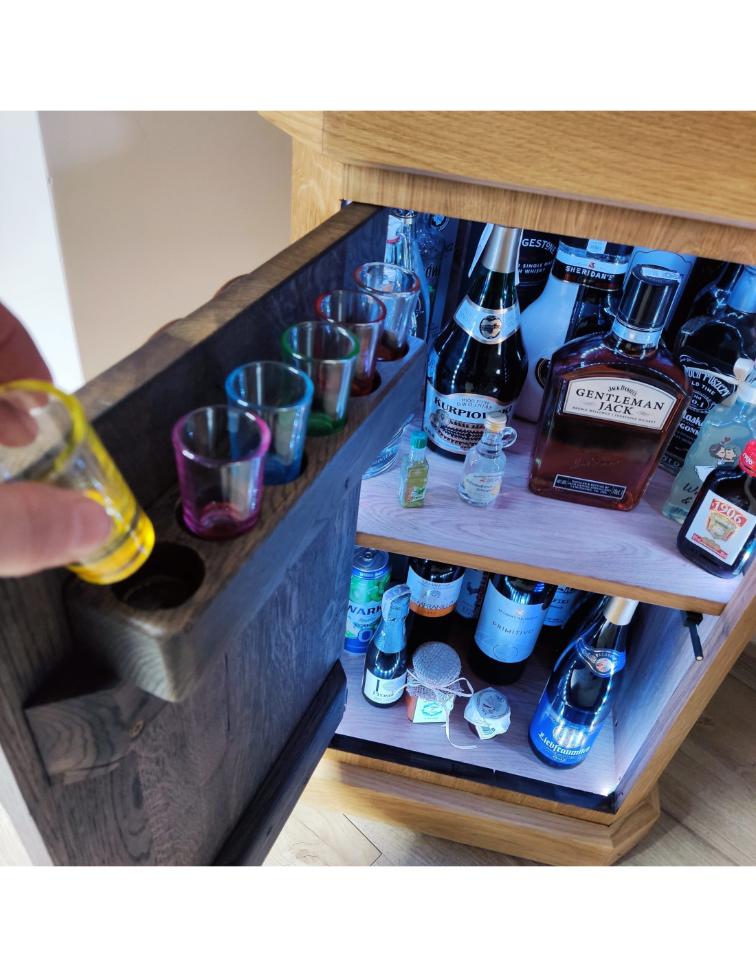 Ein zusätzliches Highlight ist die integrierte LED-Beleuchtung mit Farbwechsel- und Leuchtmodi, die sich bequem per Fernbedienung steuern lässt – sie verleiht dem Bar-Schrank eine stimmungsvolle Atmosphäre und unterstreicht seine edle Form in jedem Raum.
